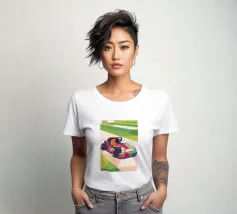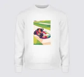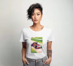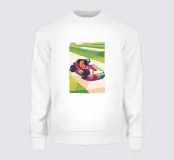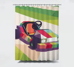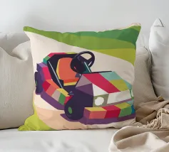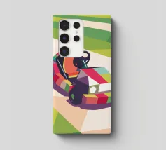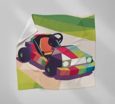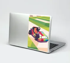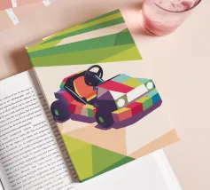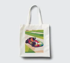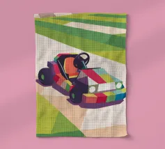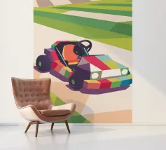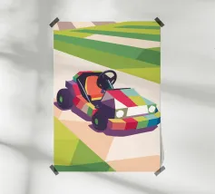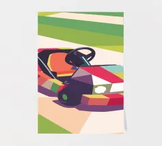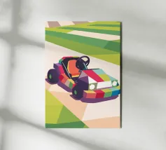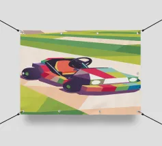 Illustrazione di un go-kart colorato su una pista con uno stile geometrico moderno.