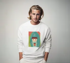 Un'illustrazione rasserenante che raffigura una persona dal sorriso gentile con in mano una tazza di caffè caldo.