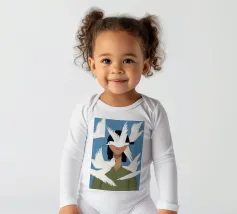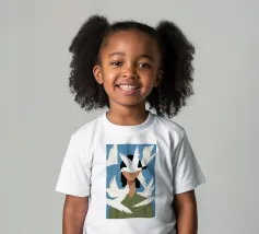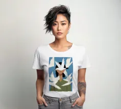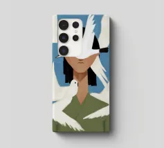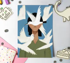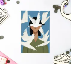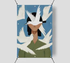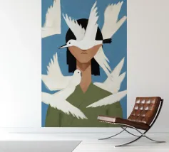 Ritratto di una persona dall'espressione serena, con due colombe o uccelli bianchi che ne incorniciano il volto. La composizione è simbolica e pacifica, con una tavolozza di colori freddi, verdi e bianchi, che evocano un senso di armonia e protezione.
