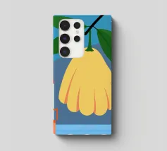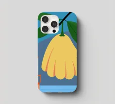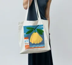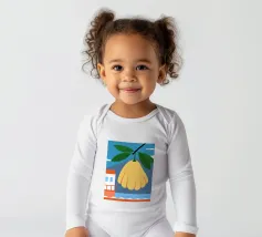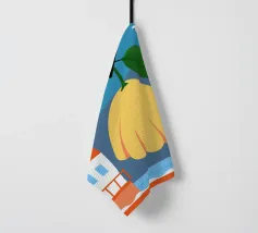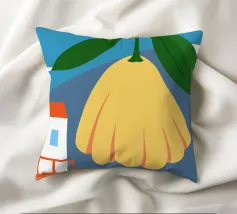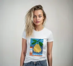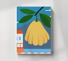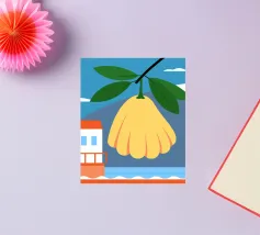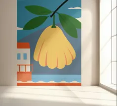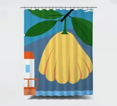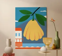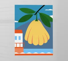 con un frutto di guava appeso a un albero, con uno sfondo di mare ed edifici.