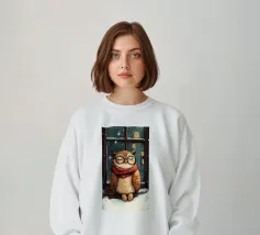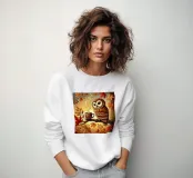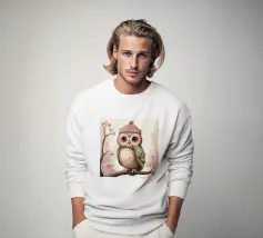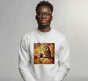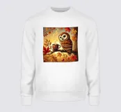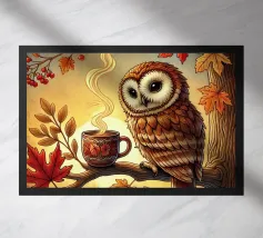 Un'affascinante illustrazione in stile cartoon di un gufo appollaiato con grazia su un ramo d'albero, circondato da vivaci foglie autunnali nelle calde tonalità del rosso, dell'arancio e dell'oro. Il gufo tiene in mano una tazza di sidro fumante, mentre la morbida luce dorata di un tranquillo tramonto illumina la scena. L'ambiente tranquillo e i dettagli stravaganti evocano l'accogliente bellezza dell'autunno.