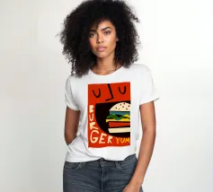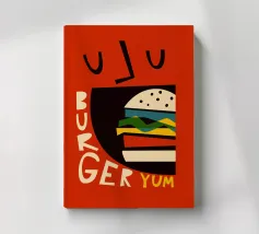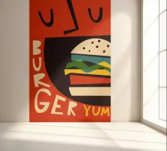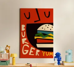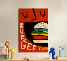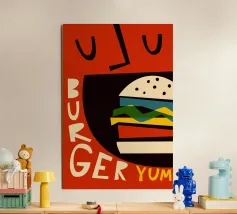 Questa stampa presenta un design audace e minimalista di hamburger in rosso, nero e giallo. Ideale per aggiungere un tocco giocoso alla cucina o alla sala da pranzo. Semplice e divertente, è ideale per chi ama l'arte grafica a tema alimentare. Disponibile in vari formati.