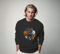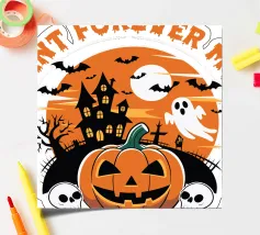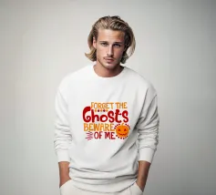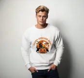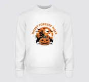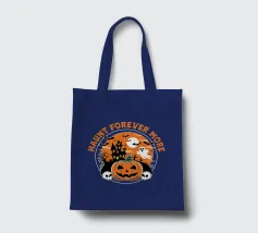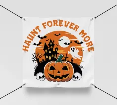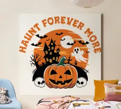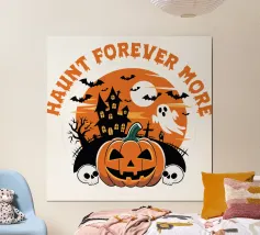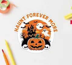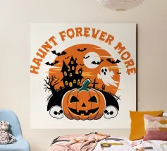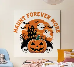 L'immagine a tema Halloween raffigura una casa infestata, una zucca intagliata, fantasmi e pipistrelli sotto la luna piena. La frase "Haunt Forever More" è riportata in alto e sottolinea l'atmosfera spettrale.