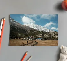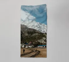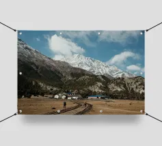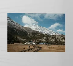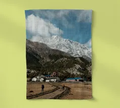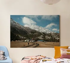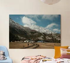 Questa potente fotografia di paesaggio immortala due escursionisti che si avvicinano a un remoto villaggio himalayano, incastonato sotto le imponenti cime innevate della catena dell'Annapurna, in Nepal. La struttura grezza delle montagne, i toni terrosi del sentiero e la vastità della scena evocano lo spirito di esplorazione e di resilienza. Che siate avventurieri o amanti della bellezza delle montagne, questa immagine porta la grandezza dell'Himalaya nel vostro spazio.