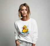 Un allegro anatroccolo giallo siede in una piccola pozza d'acqua, circondato da schizzi. Sotto, la scritta "I DON'T GIVE A DUCK".