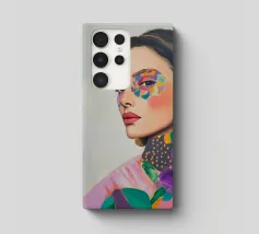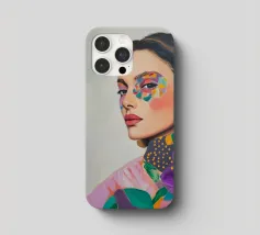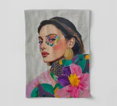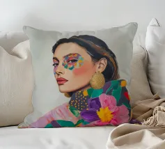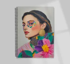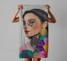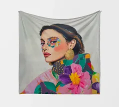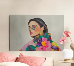Un elegante ritratto di donna con orecchini d'oro in campi di colori vivaci e motivi astratti celebra la femminilità in stile boho. Quest'arte contemporanea combina in modo armonioso moda, make-up ed eleganza.