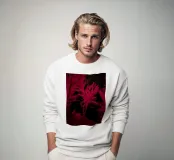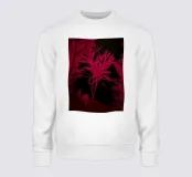 In una foresta surreale, alberi lussureggianti e piante uniche irradiano tonalità di rosso acceso nello spettro degli infrarossi su uno sfondo scuro, creando un'atmosfera ultraterrena.