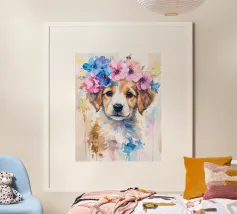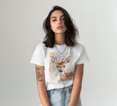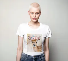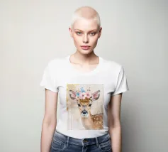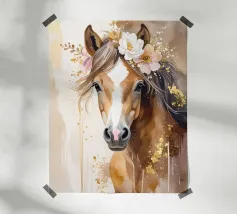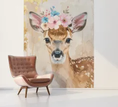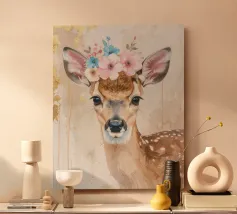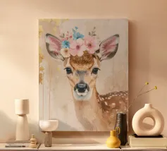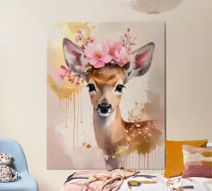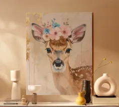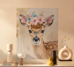 Questo design moderno raffigura un piccolo cervo con fiori sulla testa. Disegnato con delicati acquerelli e accenti dorati, unisce la bellezza naturale all'eleganza artistica. Le morbide sfumature di colore e lo stile astratto conferiscono a qualsiasi ambiente un'atmosfera romantica e giocosa, ma allo stesso tempo elegante: un vero e proprio colpo d'occhio per la vostra casa.
