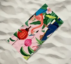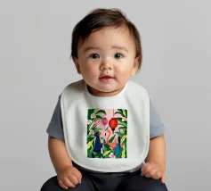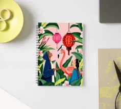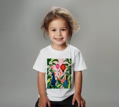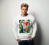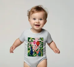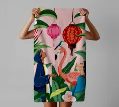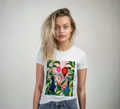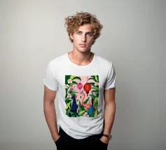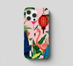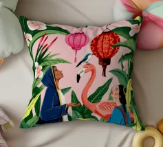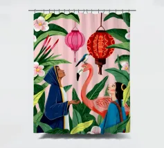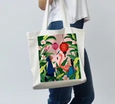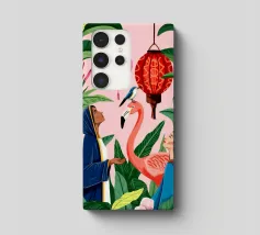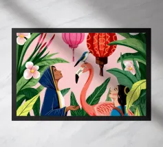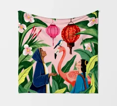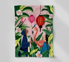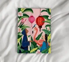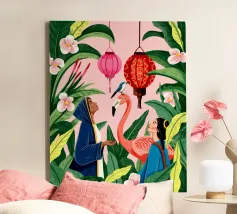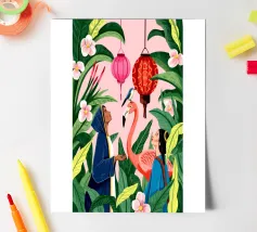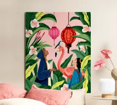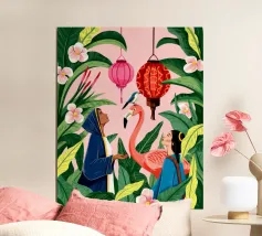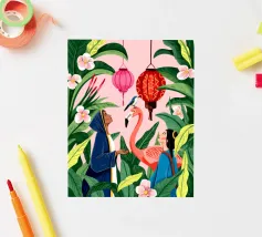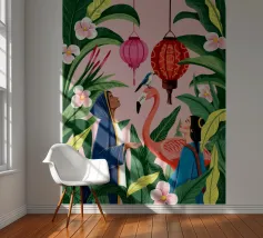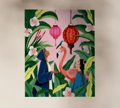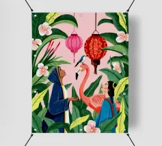 Due persone in abiti tradizionali si trovano in mezzo a grandi fiori esotici e fogliame verde.