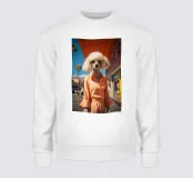 Isabelle, la barboncina dal pelo bianco, passeggia elegantemente per le strade di Palm Springs, indossando un superbo completo arancione. Con i suoi occhiali da sole dorati e il suo atteggiamento sicuro, incarna lo spirito della controcultura della Beat Generation che ha segnato la città, combinando uno stile di vita eccentrico con il senso della moda.