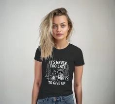 Un procione dei cartoni animati siede accanto a un falò, circondato da alberi. Il testo dice ironicamente: "Non è mai troppo tardi per arrendersi".
