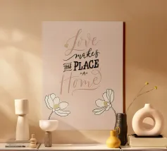Bellissima citazione per la vostra casa e per il luogo in cui vi sentite a casa. Bella composizione di lettere a mano nei caldi colori della terra. Abbinata a due fiori. Una frase meravigliosa per decorare il vostro luogo preferito. Molto dolce anche per le famiglie.