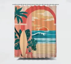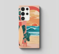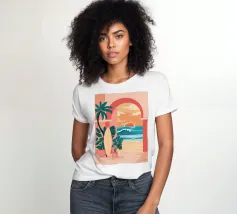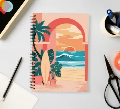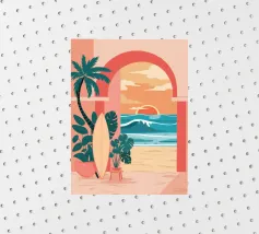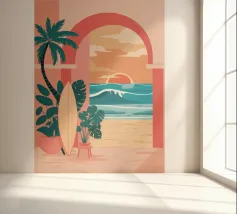 Una splendida scena di spiaggia con l'oceano calmo e il sole al tramonto, vista attraverso un arco color terracotta circondato da piante rigogliose. L'immagine crea la sensazione di entrare in un paradiso tranquillo e idilliaco.