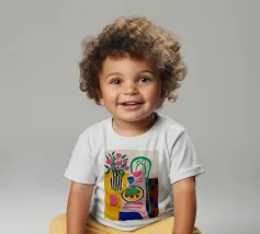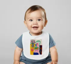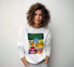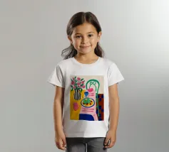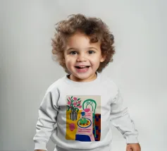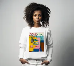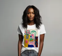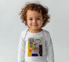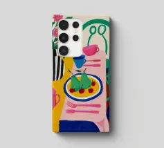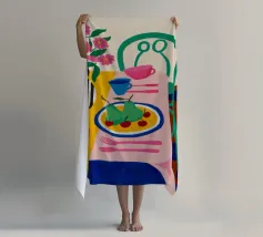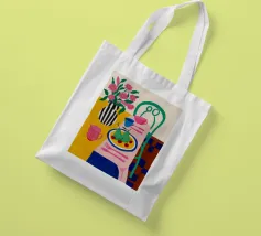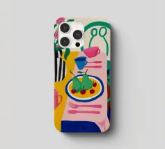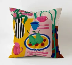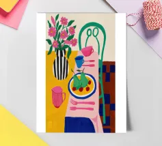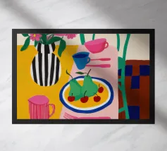 Una colorata natura morta con una teiera e una tazza eccentriche su una tovaglia a motivi, con un vaso di fiori e un piatto di cibo, il tutto in uno stile vivace e bohémien.