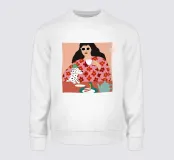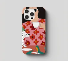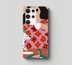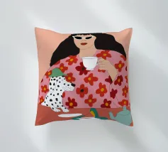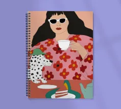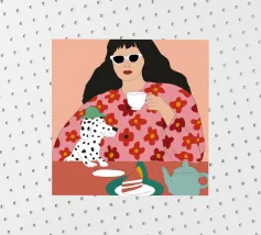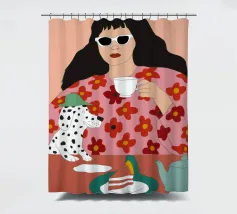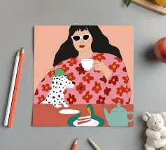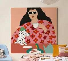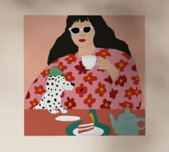 Un'elegante illustrazione di una donna con capelli scuri e occhiali da sole, che indossa un top a motivi floreali, che prende il tè con un cane dalmata che appoggia la testa sulle sue ginocchia, trasmettendo un momento di relax chic.