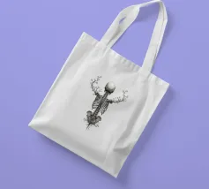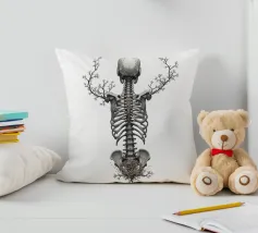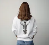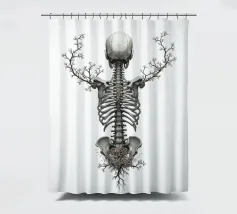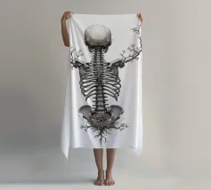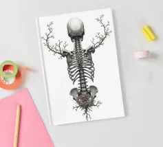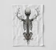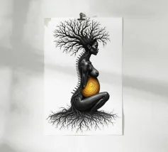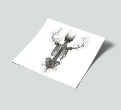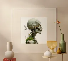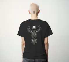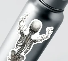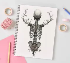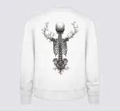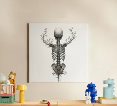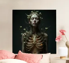 Uno scheletro umano visto da dietro, con la colonna vertebrale perfettamente eretta e le costole aperte come finestre. Dalle spalle spuntano rami che sbocciano in un rosa tenue. Dal bacino, radici floreali scendono a cascata verso il basso, fondendo il corpo con la terra. Non ha un volto, ma è diventata un giardino che si estende sia verso l'alto che verso il basso.