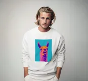 Questo spiritoso motivo pop art mostra un colorato ritratto di lama con un affascinante dente d'oro e un'espressione giocosa. I colori vivaci del rosa, del blu e dell'arancione conferiscono all'immagine un aspetto vivace e moderno. Un'opera d'arte divertente ed elegante, perfetta per chi ama l'allegria, il colore e la cultura pop.