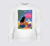 Una donna con un cappello da sole legge un libro sulla spiaggia, con un cestino da picnic accanto. La scena è una rappresentazione perfetta, serena e idilliaca di una vacanza estiva rilassante e intellettuale.