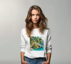 Un'affascinante stampa d'arte costiera che raffigura limoni maturi su un ramo che si affaccia sul mare azzurro e sull'architettura italiana illuminata dal sole, ispirata alla Costiera Amalfitana e alle estati mediterranee. Ideale per la cucina, il soggiorno o l'arredamento a tema vacanziero.
