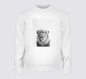 Il ritratto di un leone mostra grandi occhi espressivi e una corona floreale in bianco e nero. La morbida pelliccia è perfettamente enfatizzata in un'illustrazione fotografica minimalista e cattura lo straordinario fascino della natura. Ideale per gli amanti degli animali.