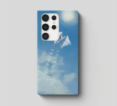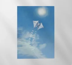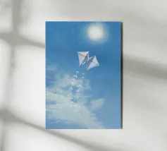 Un'illustrazione sognante e piena di luce di due aquiloni bianchi che si librano in un cielo azzurro, con delicate code di nastro che scivolano vicino al sole splendente. Con una texture pastello e una tavolozza pacifica, quest'opera d'arte cattura l'essenza della libertà, della nostalgia e della gioia tranquilla. Perfetto per asili nido, spazi ariosi e per chiunque sia attratto da scene di serenità edificanti e minimaliste.