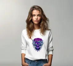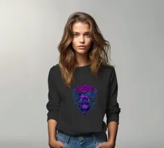 Un'illustrazione digitale vibrante e surreale di un teschio alieno che si fonde con una lampadina gocciolante, caratterizzata da colori verde neon e magenta su uno sfondo viola scuro. Il design inquietante e gocciolante combina l'estetica horror e fantascientifica.