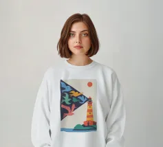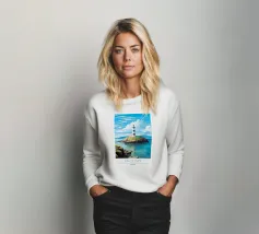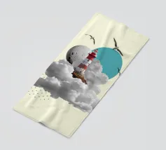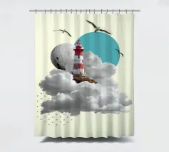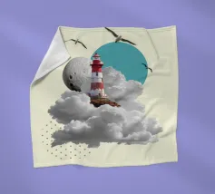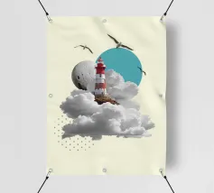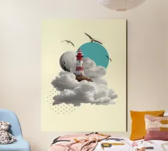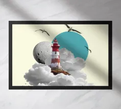 Un collage di fari stravaganti e surreali che emergono da nuvole gonfie, circondati da gabbiani impennati e da un audace sfondo lunare. Il faro rosso e bianco evoca guida, speranza e avventura onirica. Una stampa d'arte perfetta per gli amanti della nautica, i sognatori e gli appassionati di surrealismo moderno.
