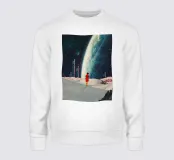 Non si può aver amato e dimenticare. ~ Donna con cappotto rosso che guarda un pianeta gigante in piedi in un paesaggio futuristico surreale, elementi di architettura floreale retrò.