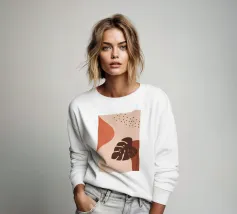 L'immagine presenta un'illustrazione astratta con una grande foglia di monstera nera e il contorno di una mano. Lo sfondo è costituito da forme morbide e fluide nei toni del beige e del marrone, che creano un'atmosfera armoniosa e organica.