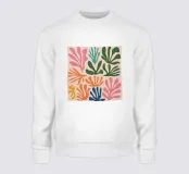 Un motivo di foglie stilizzate nei toni del verde, del rosa e della terracotta, ispirato ai ritagli di Henri Maraoui. La disposizione suggerisce una danza aggraziata di forme botaniche.