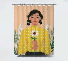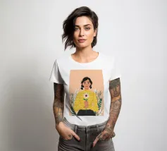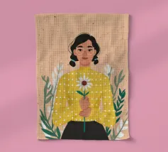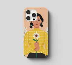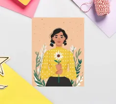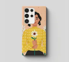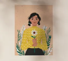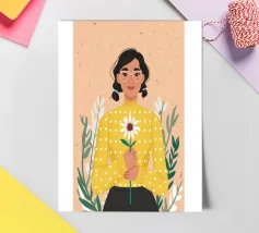 Ritratto ravvicinato di una donna che tiene in mano una singola margherita bianca. L'espressione dolce della donna e il semplice e bellissimo fiore creano una scena pura, innocente e piena di fascino sereno e discreto.