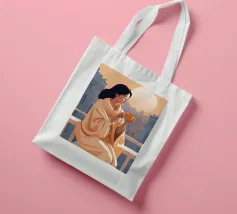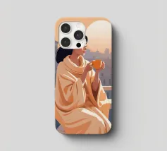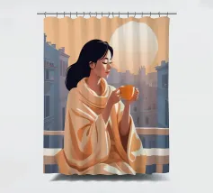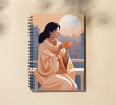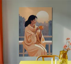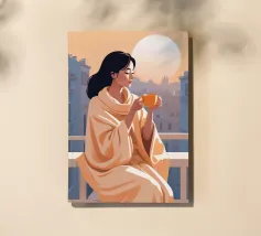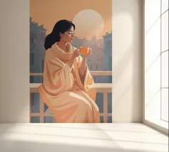 Immersa in un'alba dorata, una donna si gode il suo primo sorso di caffè mentre la città si sveglia. Quest'opera d'arte irradia calore accogliente e consapevolezza: un perfetto promemoria quotidiano per fermarsi e respirare.