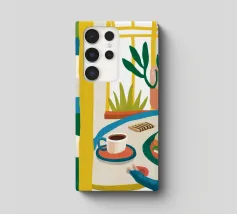 Una deliziosa scena di colazione davanti a una finestra, con caffè e panino su un piatto appoggiato su una tovaglia a scacchi bianchi e blu. La luce del sole entra illuminando il momento accogliente e allegro della mattina.