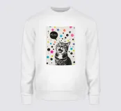 Questo simpatico gattino con una bolla che dice "Meow" cattura perfettamente la natura giocosa dell'animale. Incorniciata da coriandoli colorati su sfondo bianco, l'opera d'arte trasmette un'atmosfera festosa e vibrante che celebra la gioia e il piacere di un gatto.