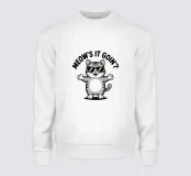Un gatto cool che indossa occhiali da sole si erge fiducioso con le braccia tese all'interno di una cornice circolare. La frase "MEOW'S IT GOIN'?" è scritta in grassetto e aggiunge un tocco giocoso.