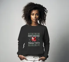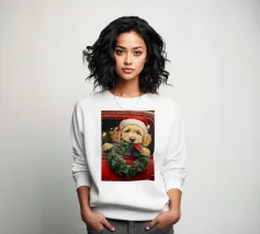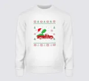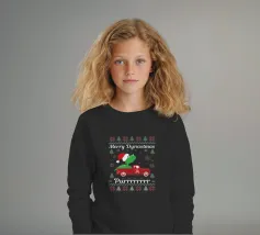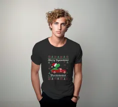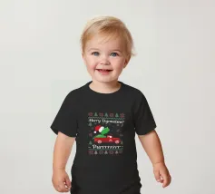 Il disegno festivo raffigura un dinosauro verde con un cappello da Babbo Natale, alla guida di un camion rosso. Intorno al dinosauro ci sono decorazioni a tema natalizio, come alberi di Natale e fiocchi di neve, con il testo "Merry Dynastmas - Purrrrrrrr".