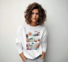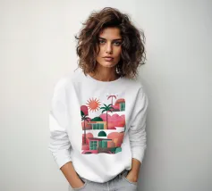 Caldo motivo moderno di metà secolo, una composizione massimalista con forme geometriche, palme, foglie tropicali, architettura e fiori.
