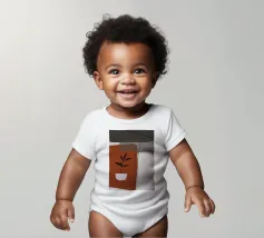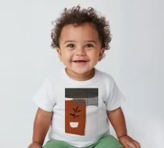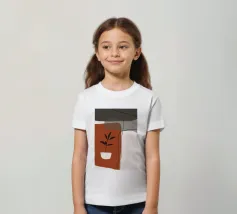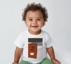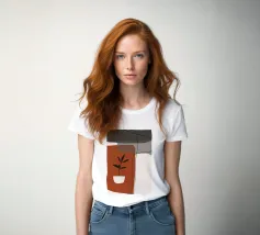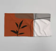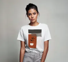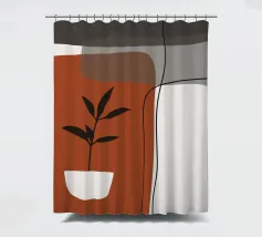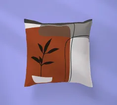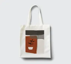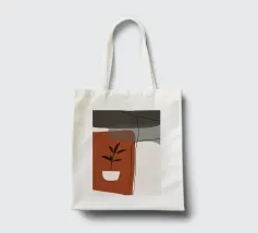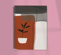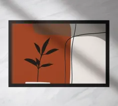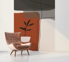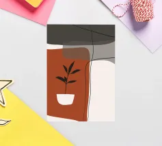Il design minimalista è caratterizzato da una semplice pianta in vaso con foglie scure, contrapposta a forme astratte e sovrapposte nei toni terrosi del rosso, del grigio e del bianco. Le linee pulite e i blocchi di colore decisi creano un'estetica moderna e rilassante.