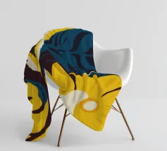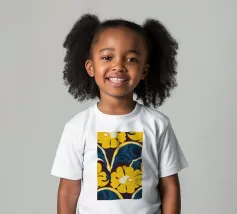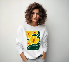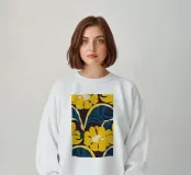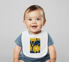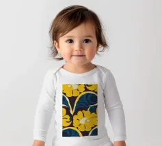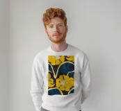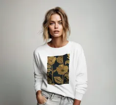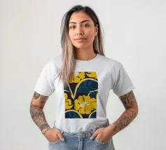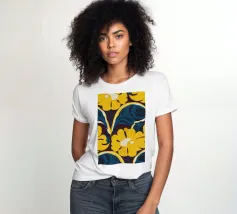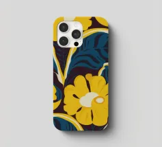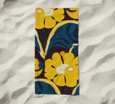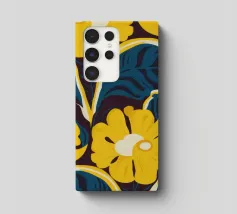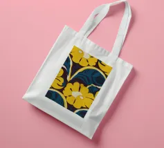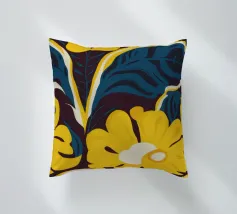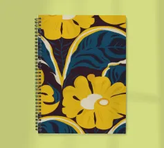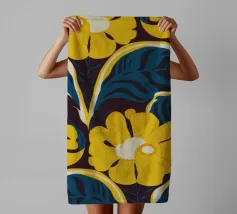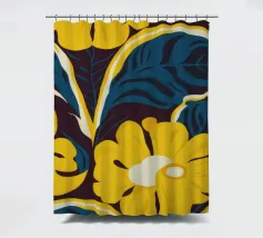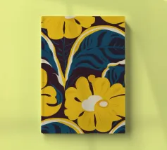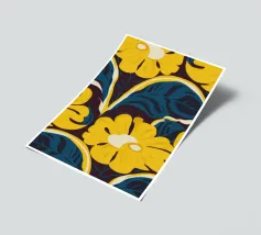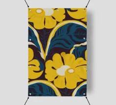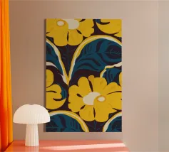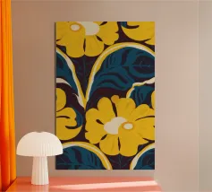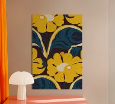 Un motivo audace e lussuoso di grandi fiori stilizzati di colore giallo oro su uno sfondo blu scuro. L'elevato contrasto e le forme eleganti creano un disegno floreale sofisticato e senza tempo.