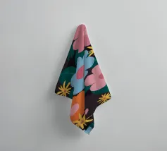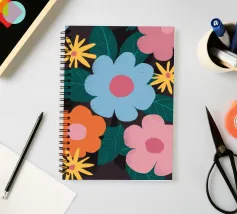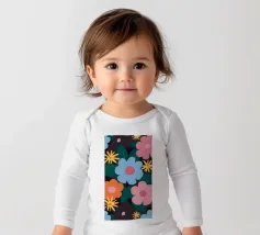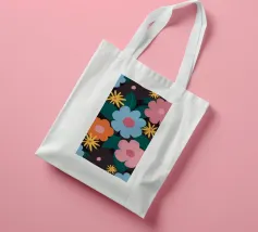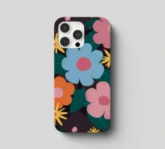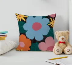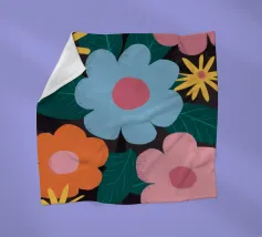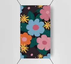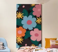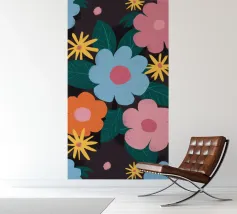 Un motivo semplice e allegro di margherite stilizzate in vari colori su uno sfondo scuro crea un disegno floreale classico, bello e senza tempo.