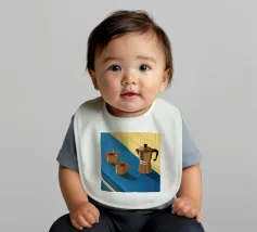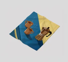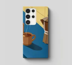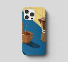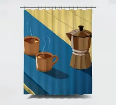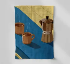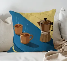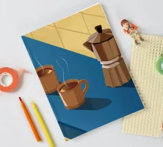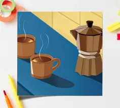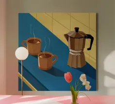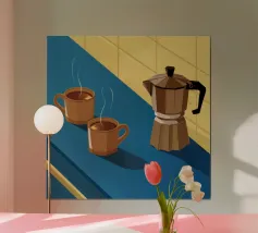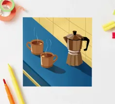 Una classica caffettiera e due tazze fumanti di caffè sono illustrate su uno sfondo bicolore, che cattura il semplice, confortante ed essenziale rituale del caffè mattutino.