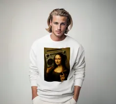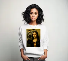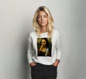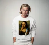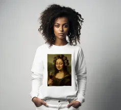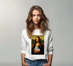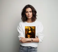 La Monna Lisa che si tappa il naso a causa del cattivo odore nel bagno con in mano una bomboletta di deodorante per WC.