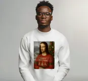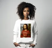 Monna Lisa indossa un maglione natalizio il giorno di Natale. Monna Lisa indossa un pullover natalizio con il testo Merry Christmas e una scena natalizia sul davanti. Dietro di lei c'è un albero di Natale con decorazioni e luci fiabesche. Sullo sfondo c'è la neve e una scena invernale.