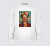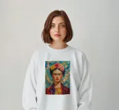 Questo vibrante autoritratto di Frida Kahlo mostra l'artista con la sua caratteristica corona di fiori e le labbra rosse in un'estetica pop art colorata. I motivi floreali e gli ornamenti sottolineano la sua forza femminile e la sua identità culturale nell'arte messicana.