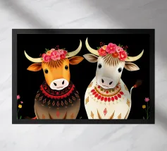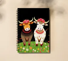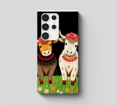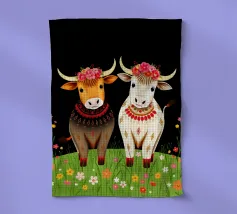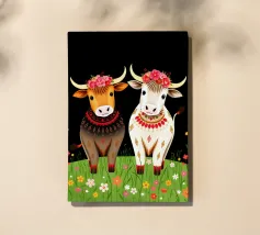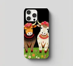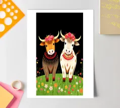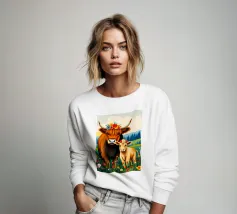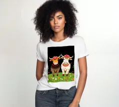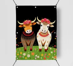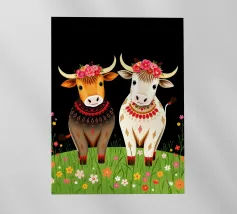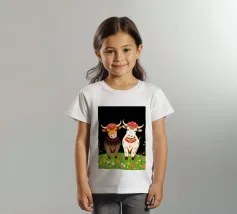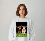 Simpatiche mucche scozzesi stravaganti in un prato selvaggio con copricapi floreali.