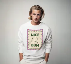 L'illustrazione colorata con tipografia minimalista presenta lo slogan umoristico "Nice Bum" a caratteri cubitali. Nei colori pastello del rosa, del viola, dell'arancio e dell'azzurro, i glutei sono messi in scena in modo creativo. Questa rappresentazione giocosa celebra la fisicità e l'erotismo in modo astratto.