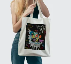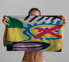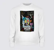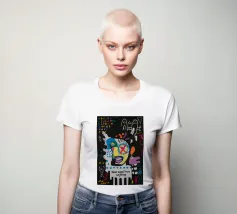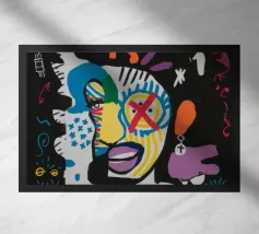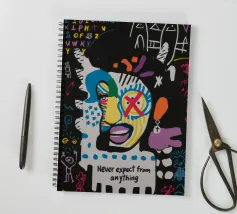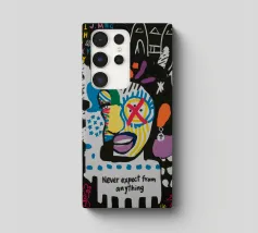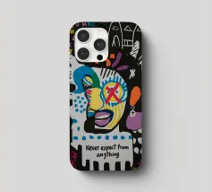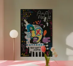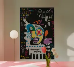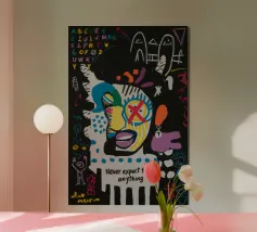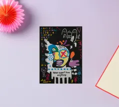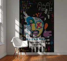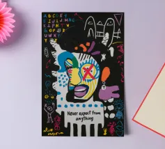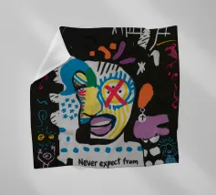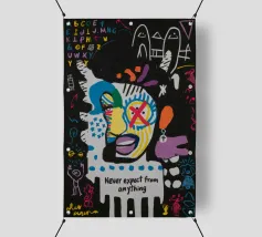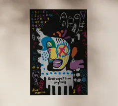 Un volto astratto con occhi a forma di X e una bolla che recita "Non aspettarti mai nulla". I ghirigori e le frasi stratificate generano una narrazione visiva che fa riflettere.