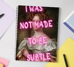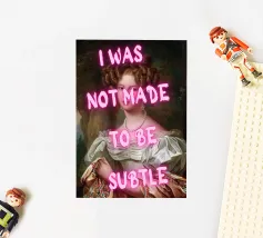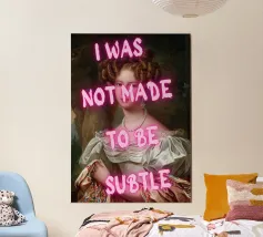 Liberate il vostro lato più audace con "Not Subtle", un'accattivante stampa pop art che fonde l'eleganza storica con un potente messaggio moderno. Questa straordinaria opera d'arte presenta un ritratto classico, rivisitato in chiave contemporanea. Sovrapposto al vivace testo rosa neon "I WAS NOT MADE TO BE SUBTLE", è una testimonianza dell'individualità e dell'espressione di sé. Questo pezzo è ideale per chi apprezza l'arte che si fa notare, fondendo la bellezza tradizionale con uno spirito ribelle. Stampato a un'eccezionale risoluzione di 7000x5000 pixel e 300 dpi, che garantisce la cattura di ogni dettaglio e del vivido bagliore del neon.