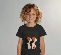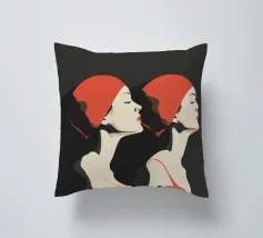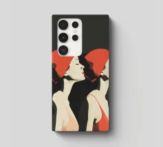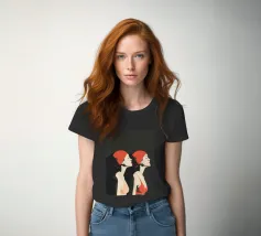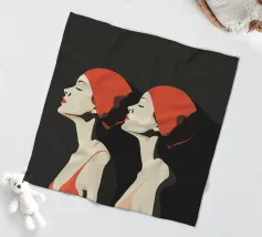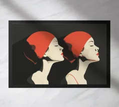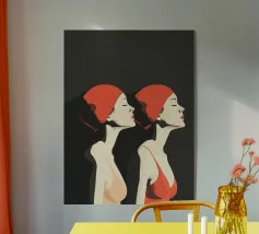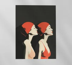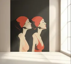 Una sorprendente illustrazione minimalista di due nuotatrici a mezzo busto di profilo, realizzate in audaci toni neri e rossi. Le loro forme eleganti e le linee fluide catturano movimento e forza, fondendo semplicità ed energia dinamica. Un omaggio moderno ed elegante all'atletismo e alla raffinatezza artistica.