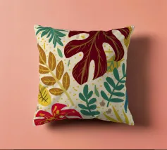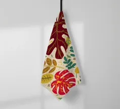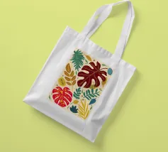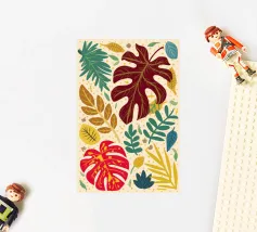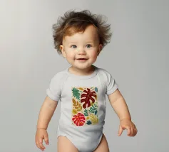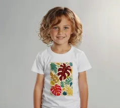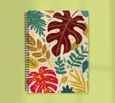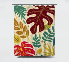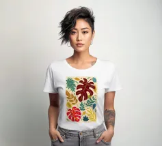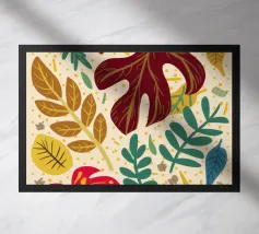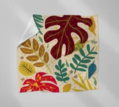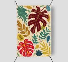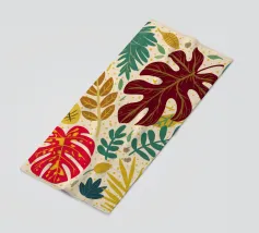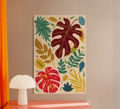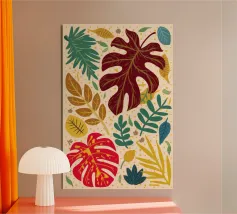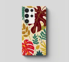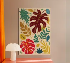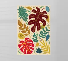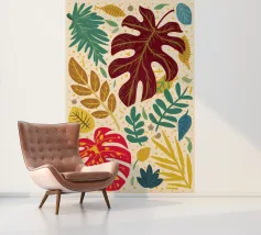 Un suggestivo motivo di monstera stilizzata e altre foglie tropicali in calde tonalità giallo oro, terracotta e marrone su uno sfondo crema chiaro, che evoca una sofisticata e calda atmosfera botanica.